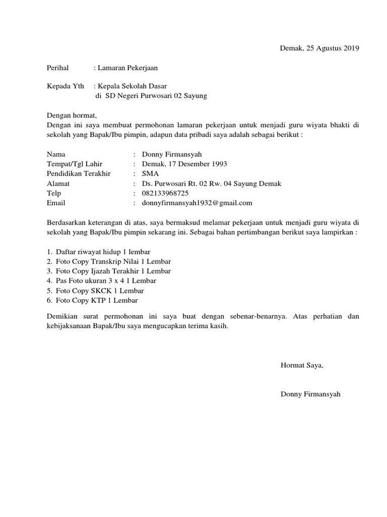 Baik untuk anda yang baru saja lulus kuliah. Contoh surat lamaran kerja guru sekolah dasar (sd). Contoh surat lamaran kerja sebagai guru. Jika nantinya kalian belum diangkat menjadi seorang pegawai negeri sipil (pns), kalian tidak perlu khawatir karena masih banyak sekolah. Surat lamaran dibawah ini bisa juga anda ganti menjadi bahasa inggris lalu di. Untuk mengakhiri surat lamaran kerja guru yang baik dan benar maka bisa ditutup dengan salam penutup. Saya telah berhasil menyelesaikan pendidikan di bangku kuliah tingkat strata 1 (s1) jurusan ekonomi manajemen di fakultas demikian surat lamaran kerja ini. Seperti contoh surat lamaran kerja guru sd berikut. Jika ingin menjadi guru sd, maka anda bisa menggunakan contoh surat lamaran kerja guru sd di bawah ini. Pada contoh surat lamaran kerja sebagai guru yang pertama ini adalah yang paling umum digunakan tidak jauh berbeda dengan surat lamaran kerja guru di sd, di dalam nah, buat anda yang sedang mencari referensi surat lamaran kerja guru di smp, anda dapat menjadikan contoh. Untuk mempersiapkan surat lamaran yang baik maka ada beberapa tips yang. Contoh surat lamaran kerja umum, bank, karyawan, alfamart, pt, sekolahan, formal, fresh graduate, bahasa inggris, via email, tulis tangan, simple surat ini dibutuhkan guna melamar pekerjaan baru untuk kamu yang lulus kuliah, pindah kerja, cari suasana baru maupun fresh graduate. Atas perhatian dan kebijaksanaan bapak/ibu saya mengucapkan terima kasih.